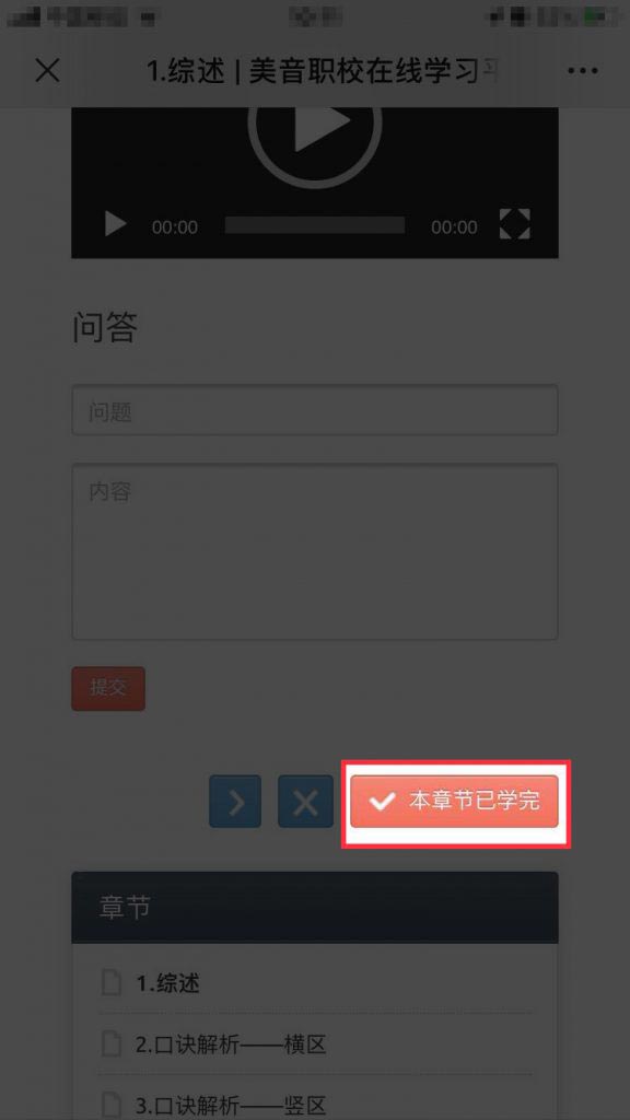 1.视频观看之后在视频下面有一个“本章节已学完”按钮,点击一下。